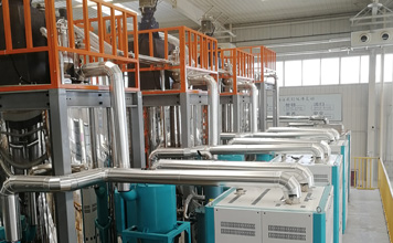 運用全自動空氣管道輸送上料的方式,多應用于幾臺擠出機并列同事生產供料,在這樣比較大規模生產的擠出制品車間內,輸送料系統由一根總送料管道,然后再分出數個支管道,分別給各個擠出機料斗送料。
