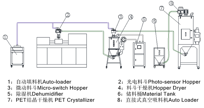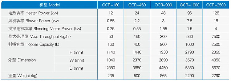 OCR系列密閉循環干燥結晶機用于持續結晶非晶化材料,將尚未晶化的PET原料或回收料結晶成可以直接除濕干燥的結晶原料。該系統包括加熱裝置,保溫料桶 及攪拌組件。當未晶相化的PET原料或粉碎料進入料斗后,對其進行結晶處理,同時進行攪拌,可防止原料結塊并降低產品不良率。結晶后的塑膠可以從料斗底部 輸送到儲料桶或直接輸送至干燥料桶中干燥后使用。