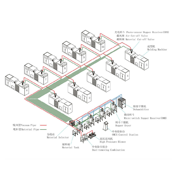 集中供料系統(tǒng)作為注塑車間不可缺少的一部分,可以有效的解決供料和自動分配比例的難度,可實現將多種原料自動供給任意的單機使用,主要包括原料的干燥處理,配色處理,物料回收料利用,可以對原料的整個輸送過程實行高度的監(jiān)測和自動化控制,并能滿足24小時不停機的生產需要。